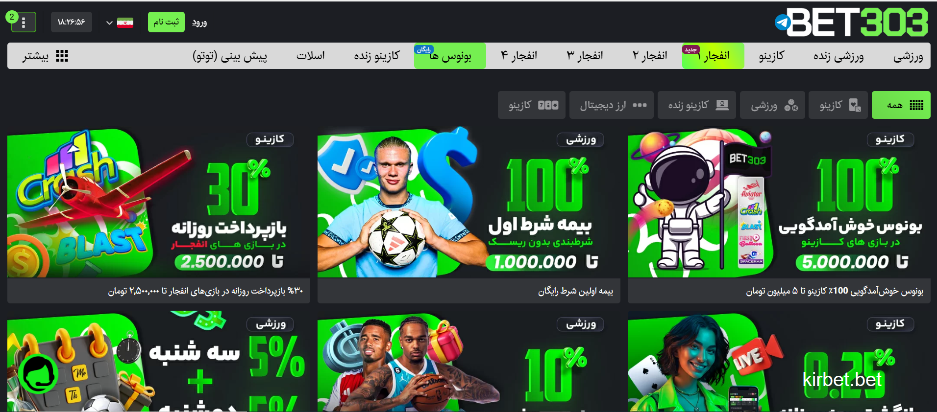 بت 303 با ارائه انواع بازی ها و گزینه های شرطبندی، از جمله شرطبندی های زنده و بازی های کازینویی با طراحی مدرن و کاربرپسند، تجربه ای امن و لذت بخش را برای کاربران خود فراهم می آورد.